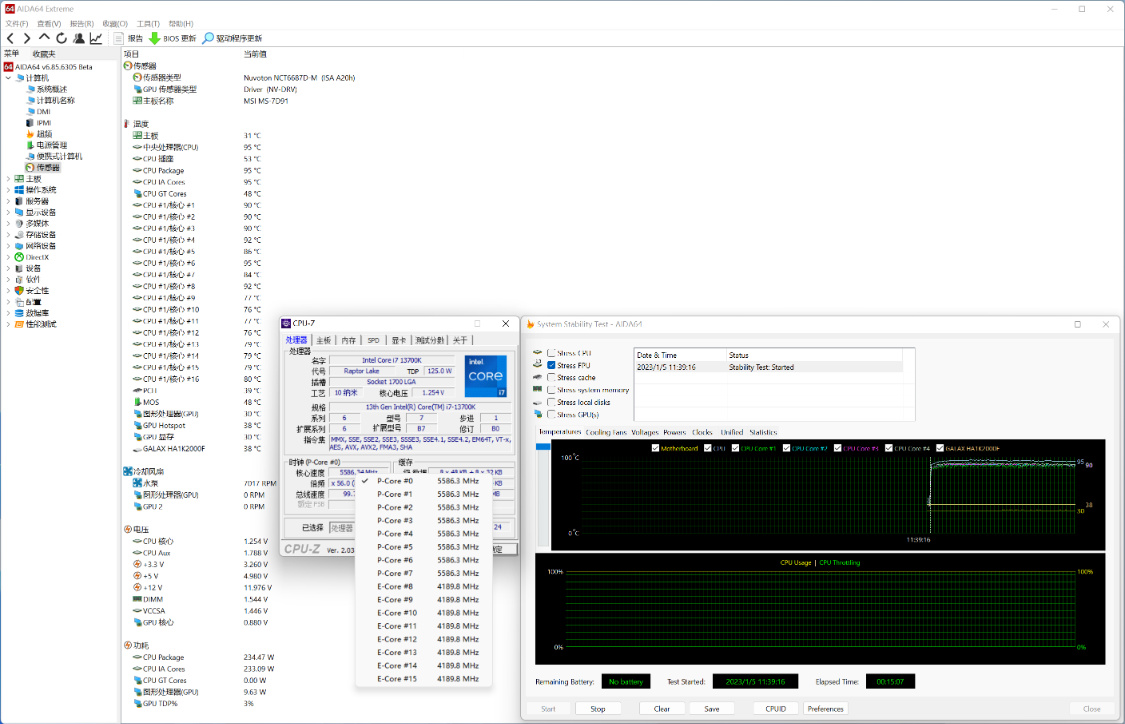 手动OC至5.6GHz后,烤机15Min,CPU温度拉高至95°,CPU功耗240W左右;