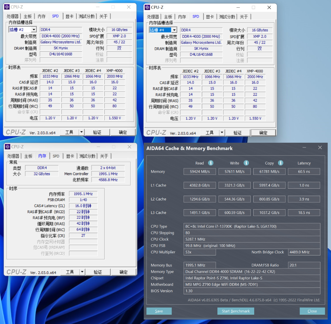 开启XMP,分频模式设为Gear1后,读取速度为59424 MB/s,写入速度为57611 MB/s,复制速度为61781 MB/s,延时为60.5 ns;