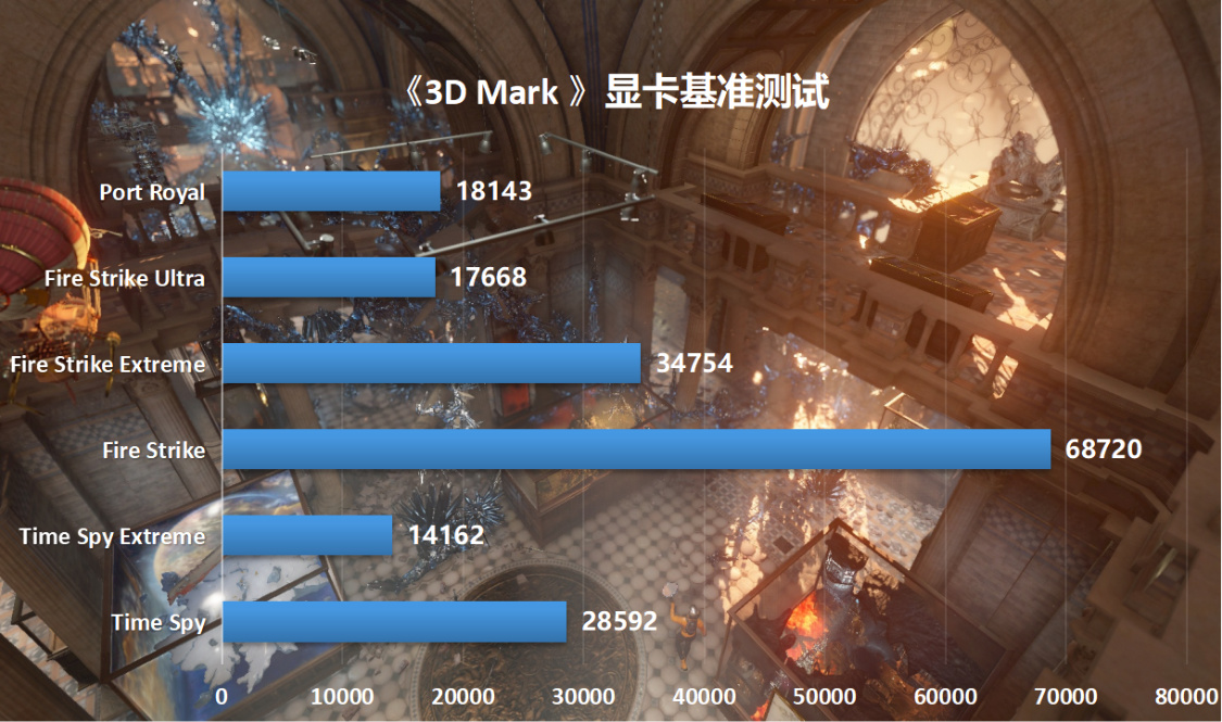 3D Mark显卡测试,Time Spy显卡得分28592分,Time SpyExtreme显卡得分14162分,Fire Strike显卡得分68720分,Fire Strike Extreme显卡得分34754分,Fire Strike Ultra显卡得分17668分;Port Royal光追测试得分18143分;