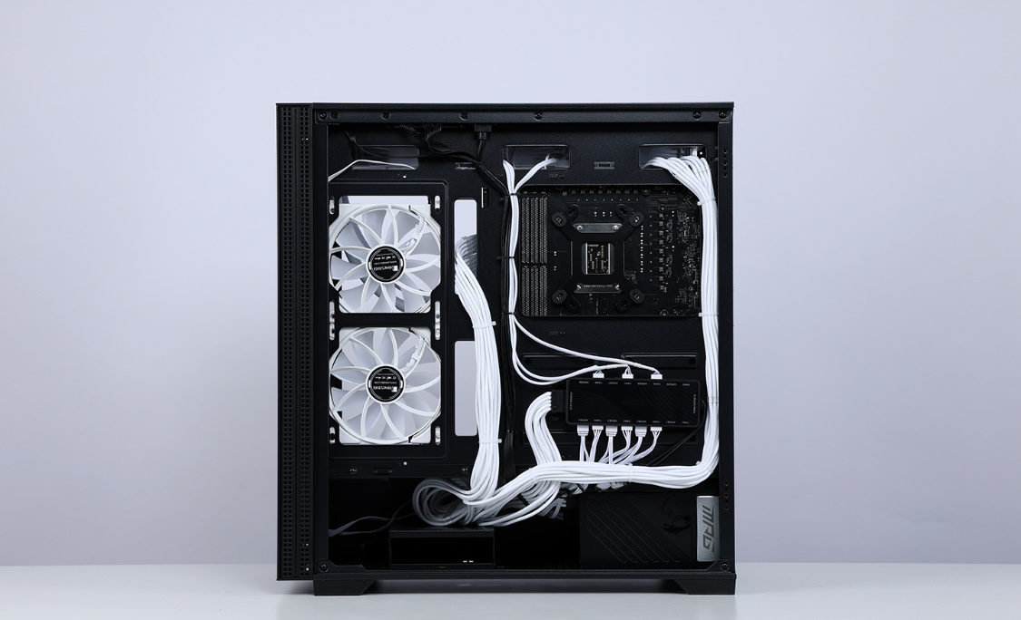 电源进机箱,简单理个线,同时把机箱风扇也全都安排上;