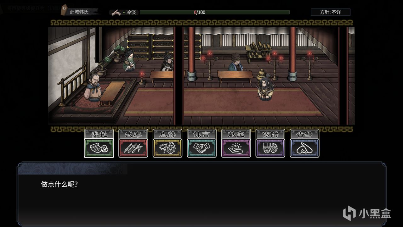 因此,游戏Demo中想要和豪族搭上线,得主动送点礼品,类似《太吾绘卷》的72500文钱,算是设了个门槛。于此同时,游戏也存在着一条纯粹的平民路线,即学刘皇叔的边地游侠路线。