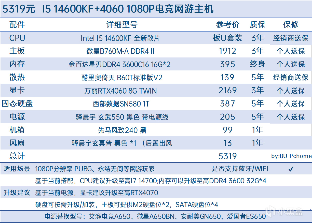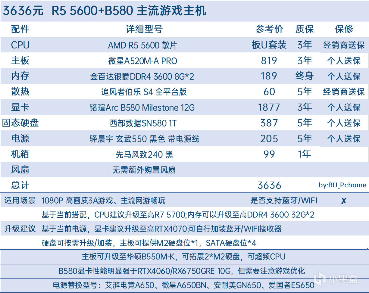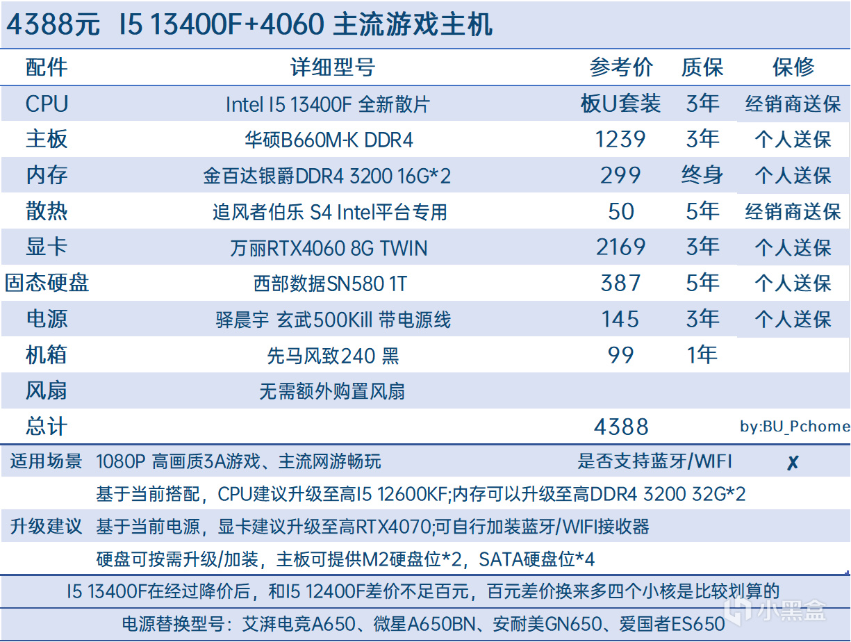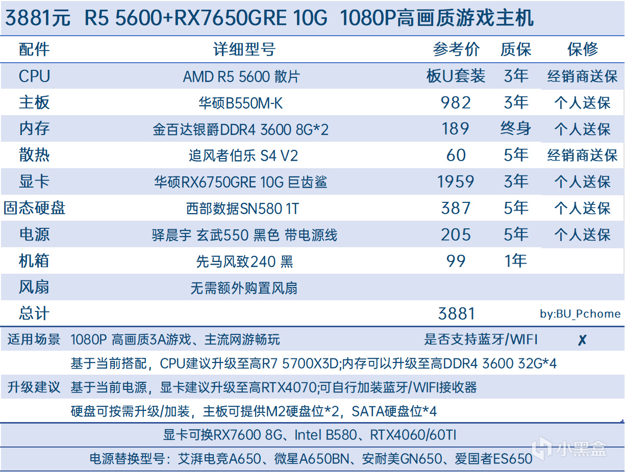 關於電源:如果覺得我給的電源檔次偏低,自己可以加錢換其他型號,更換顯卡時請務必關注電源是否夠用/機箱兼容性;