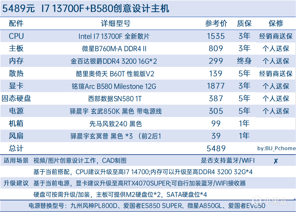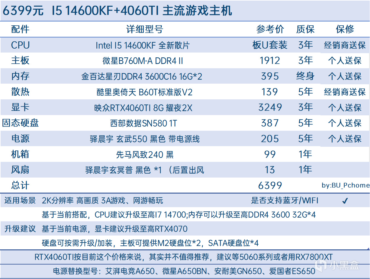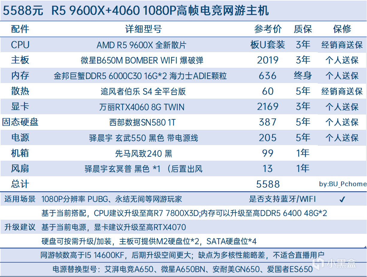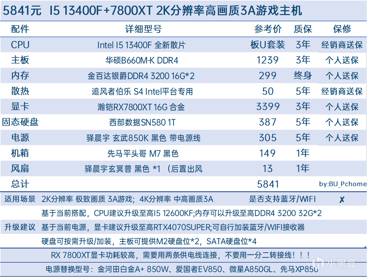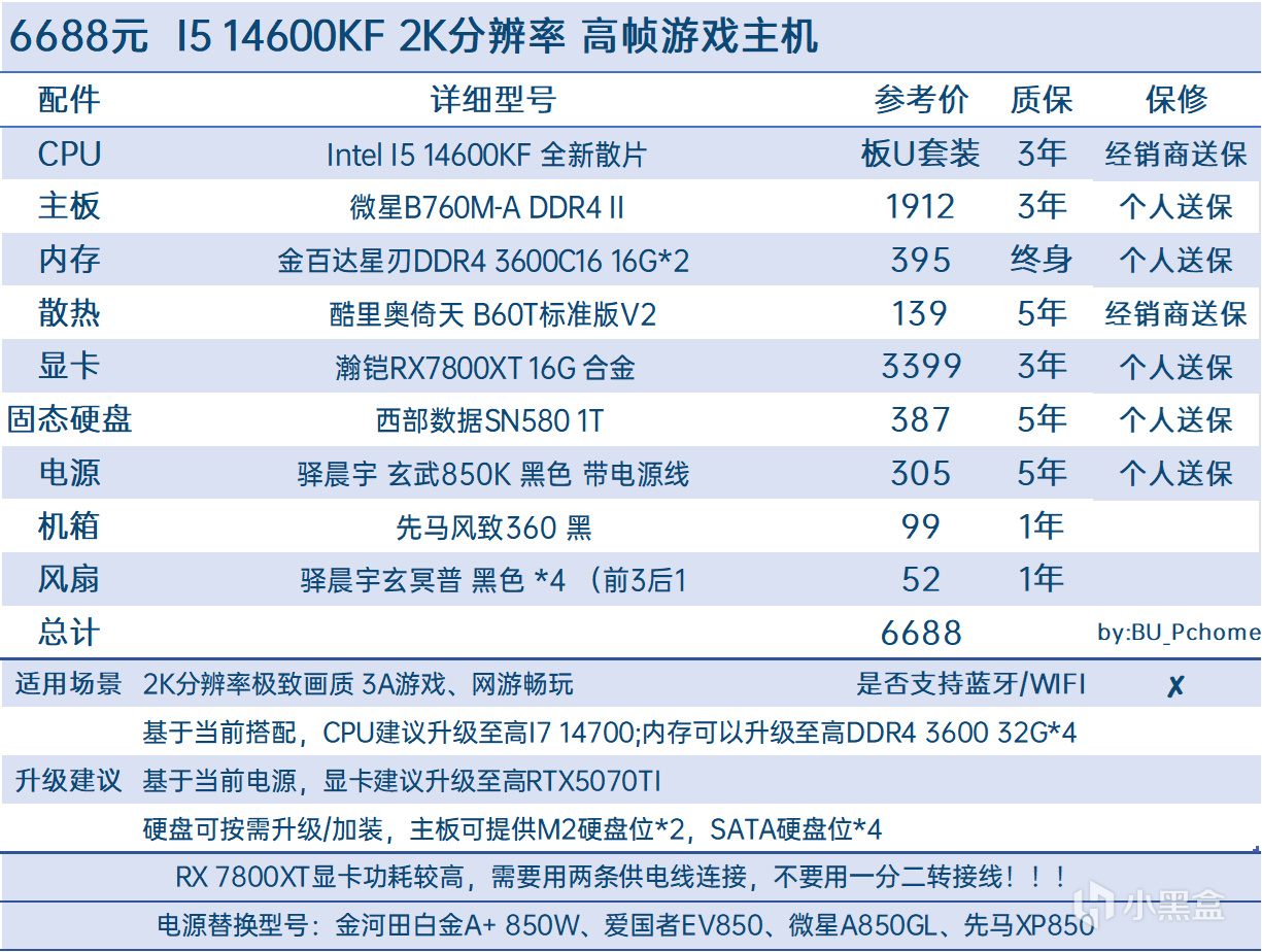 關於電源:如果覺得我給的電源檔次偏低,自己可以加錢換其他型號,更換顯卡時請務必關注電源是否夠用/機箱兼容性;
