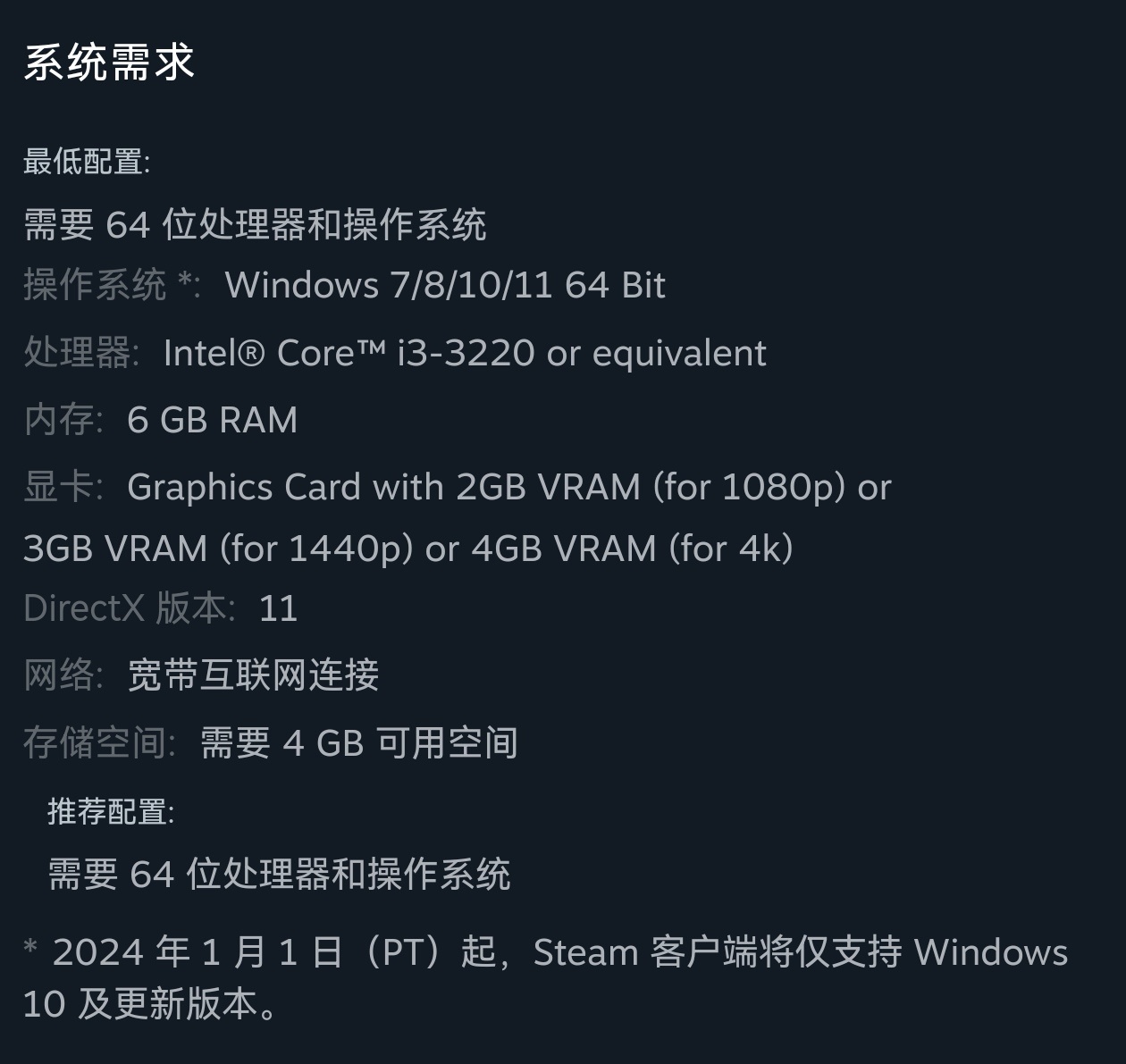 遊戲配置要求: