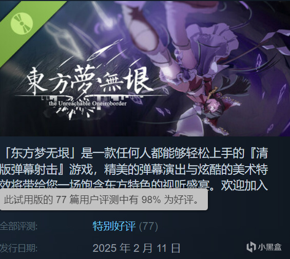 這是一款東方題材的彈幕射擊遊戲,目前demo已經上線steam,有3個關卡和4個BOSS可玩,好評98%!唯一的差評是嫌棄太簡單--