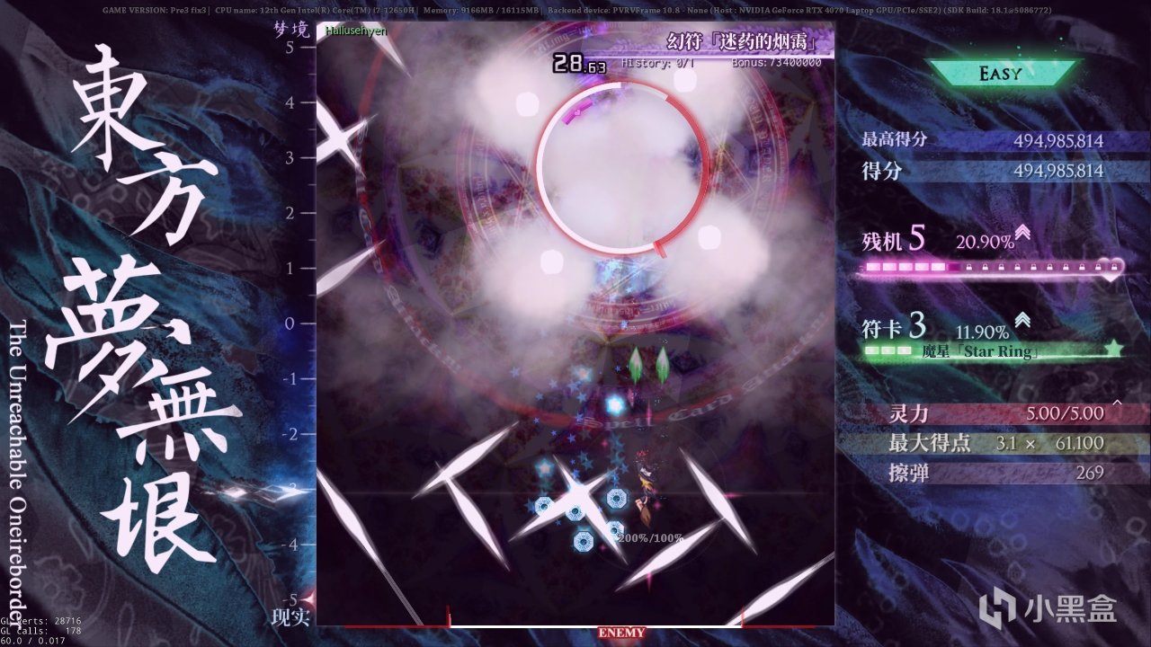 不僅如此,遊戲的命數稱爲“殘機”,和符卡使用次數一樣,都可以在戰鬥中完成補充,我最好表現的一局是帶着6條命通關(demo)。