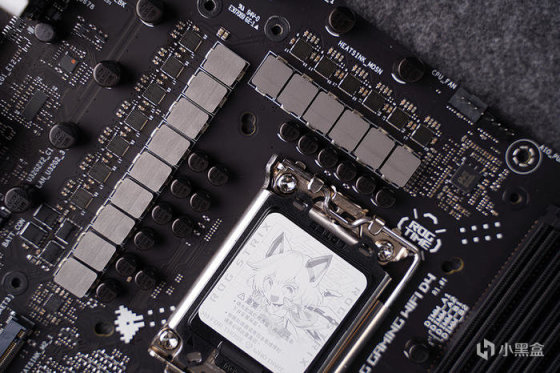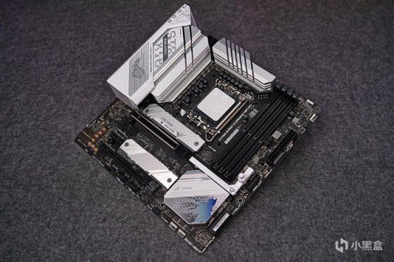 主板本体,采用的是标准 MATX 版型规格,黑色 PCB,银白色散热马甲,模块机甲风格斜面切割样式,表面吹雪姬剪影等元素点缀装饰 ,个人觉得长得还不错。
