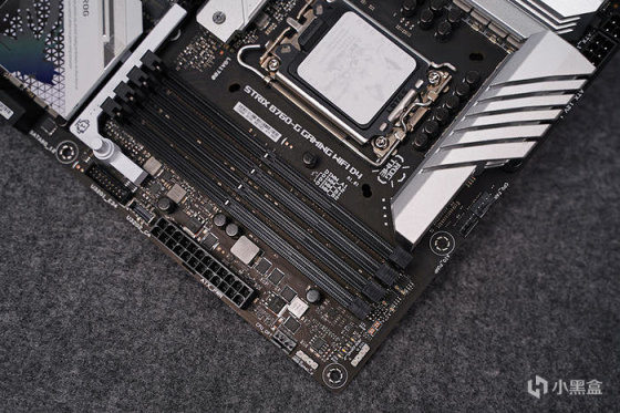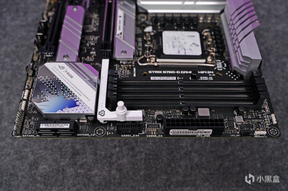 另右上角两个 5V ARGB 接口,CPU OPT 4PIN 接口,13 代依旧给到有 D4 和 D5 两种内存控制器, B760 小吹雪搭配四条内存卡槽,单边卡扣设计,单条支持 32GB,最高 128GB, 搭载华硕 OptiMem II技术,D4 频率最高可达 5333Mhz + OC。