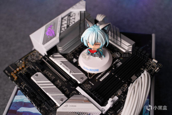 翻开内盒,可再次见到吹雪姬,华硕这是想让玩家有开手办的感觉吗?但包装形式也没啥特别的,白色卡纸分层放置,上层主板和 WI-FI 天线,下一层则是其它的附件。