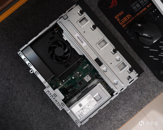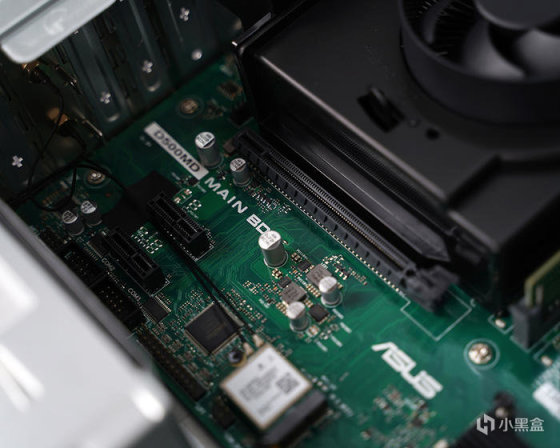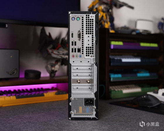 尾部主板 I/O 接口也還算豐富,頂上兩個老式的 PS/2 鍵鼠接口,在這臺機子上得到了保留,或許對於辦公用戶還留有一定的價值吧,下方則是 HDMI、VGA 接口,四個 USB 2.0 接口,一旁千兆 LAN 接口,最下方則爲三個音頻接口;給到有四個半高 PCI 安裝位,對應相應規格的拓展,位置上附帶了無線網卡,爲 WIFI 6 規格,支持 2.4G 和 5G 頻段,藍牙 5.2,底下則是電源接口,裏頭爲類似於 1U 體積的小電源。