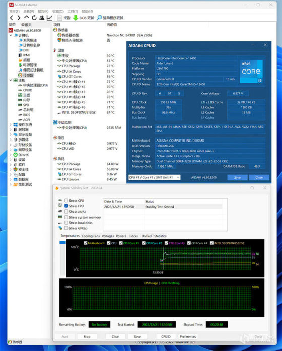 CPU 滿載溫度表現,室溫 15 度左右,AIDA64 單烤 FPU 壓力測試,20分鐘左右,全核 3.6G,核心溫度最高 73°C,CPU 顯示功耗 65W 左右。