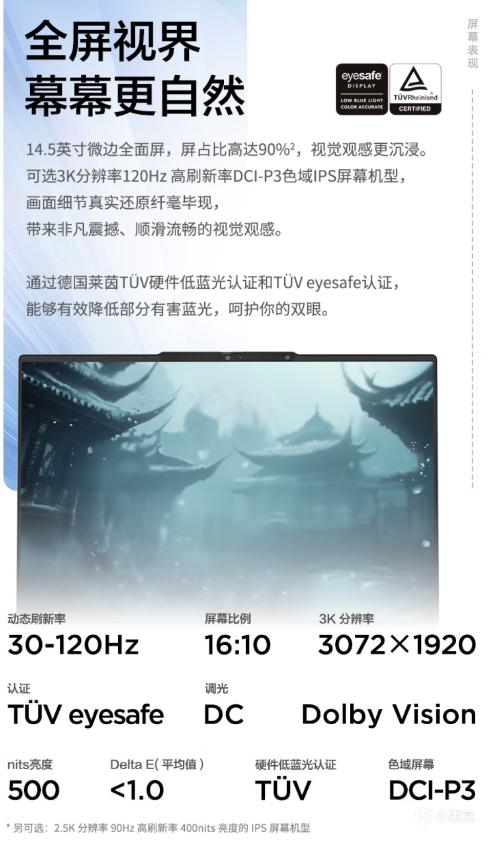 14.5英寸 3K 120Hz IPS屏,500尼特亮度