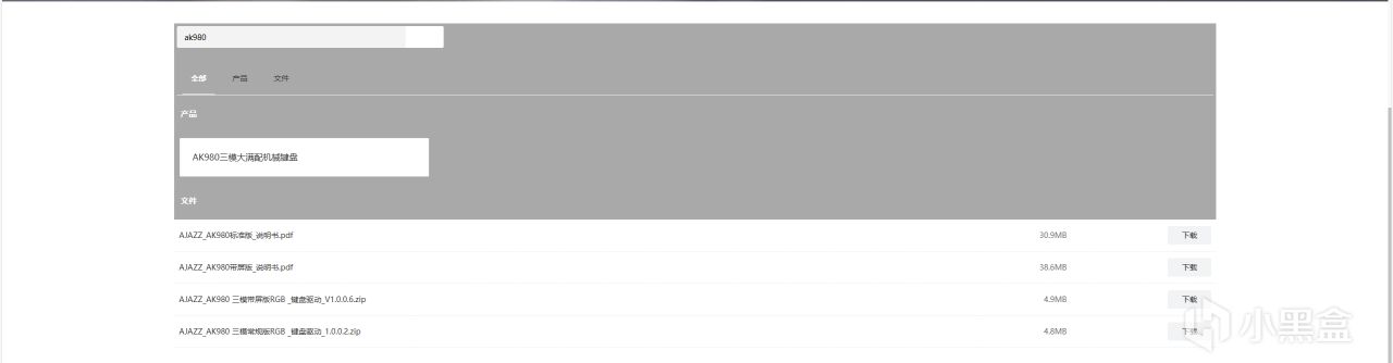 3.去浏览器搜索黑爵的官网,点击驱动文件,然后搜索AK980选择带屏幕的RGB那个版本(当然以你自己键盘的版本为准,还有一个不是RGB的)下载安装即可