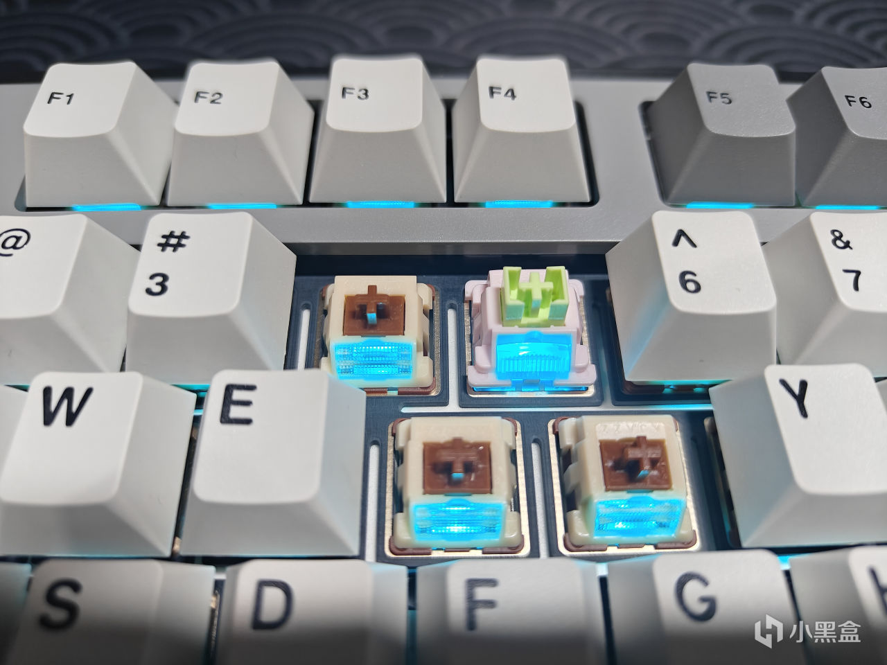 这把键盘的灯光并不是很亮,我将灯光亮度调至最大,两个轴都有导光柱,虽然明显看出花田轴要亮很多。但给人一种恰到好处的感觉