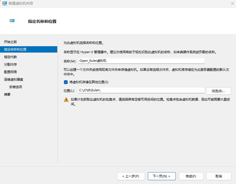 跟着指引走,名稱和虛擬機儲存位置根據自己的需求來就行,完成後點擊下一頁。