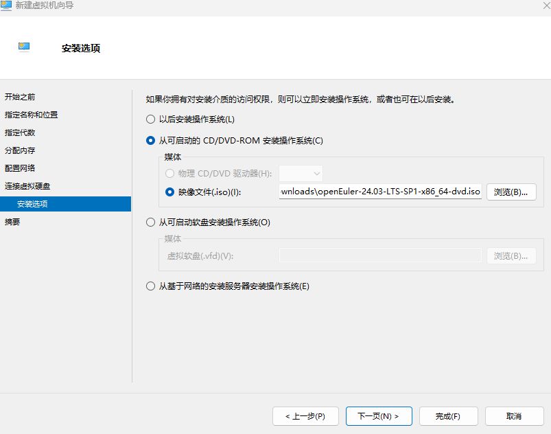 根據你的系統安裝方式選擇,一般都是使用映像文件,在該頁面直接掛載。如果手上暫時沒有文件也可以選擇以後安裝系統。點擊下一頁,然後點擊完成,你的第一個虛擬機就創建好了。