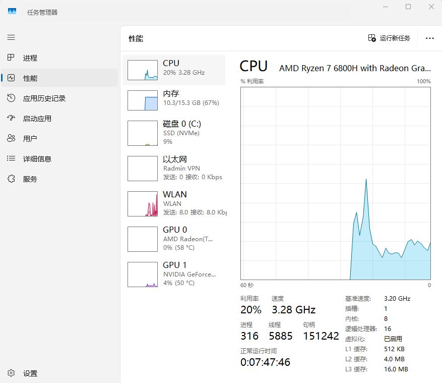 首先打開任務管理器,在左側菜單欄選擇性能,查看右下角虛擬化是否已經啓用,一般電腦都是默認啓用的,如果沒有啓用需要開機時在BIOS界面開啓。