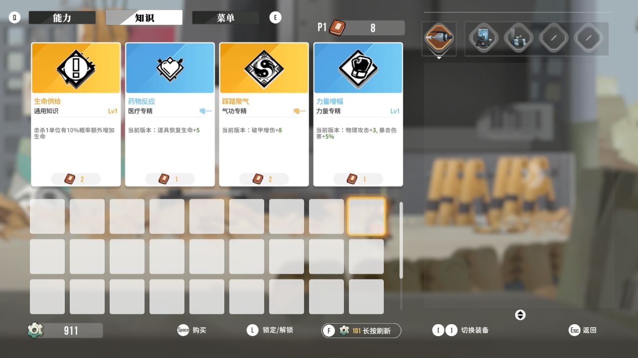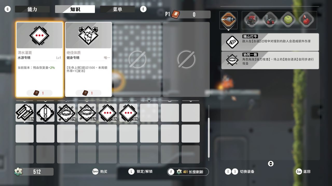 前文提到的知识点,是一种比较直白的局内构筑。玩家通过各种方式获取知识点后,可以在相应界面(按下TAB)消费,购买一系列的强化。
