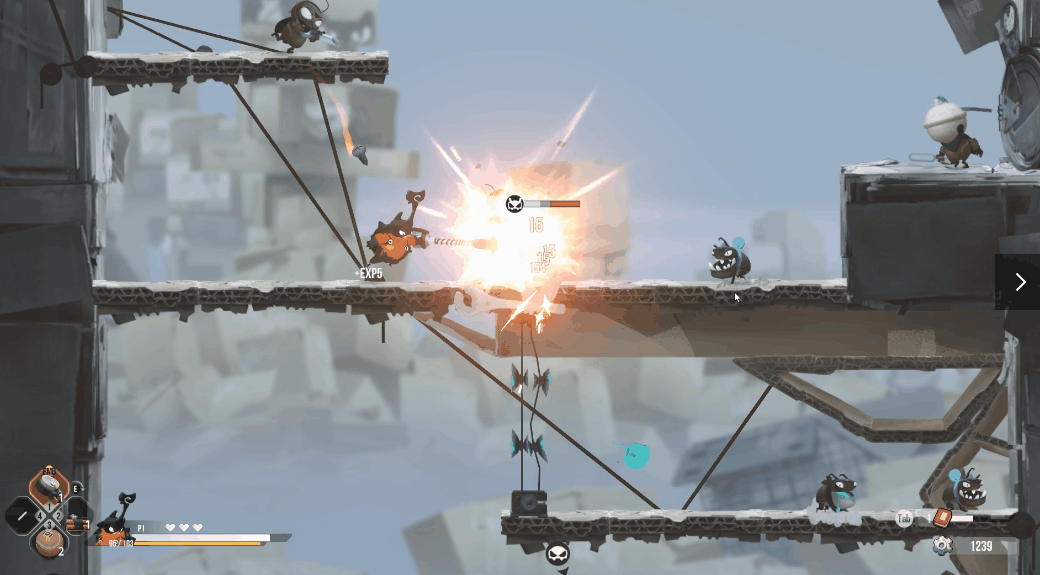 《虫虫巴迪》的动作部分丝滑流畅,普攻各段的衔接自然迅速。多次命中后,会触发一个附带击飞和位移的强力攻击。倘若将敌人撞到墙壁或者其他倒霉蛋身上,会有额外伤害。