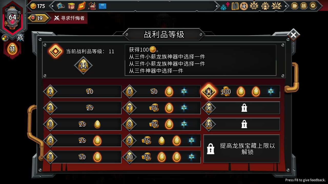 这次的Demo中,比较有意思的就是宝藏系统了。小薪龙族与它臭名昭著的同类一样,钟爱金银财宝。通过特定方式(例如击杀获取、死亡后结算)积攒宝藏,在战斗结束后,可以选择一次性搜刮。