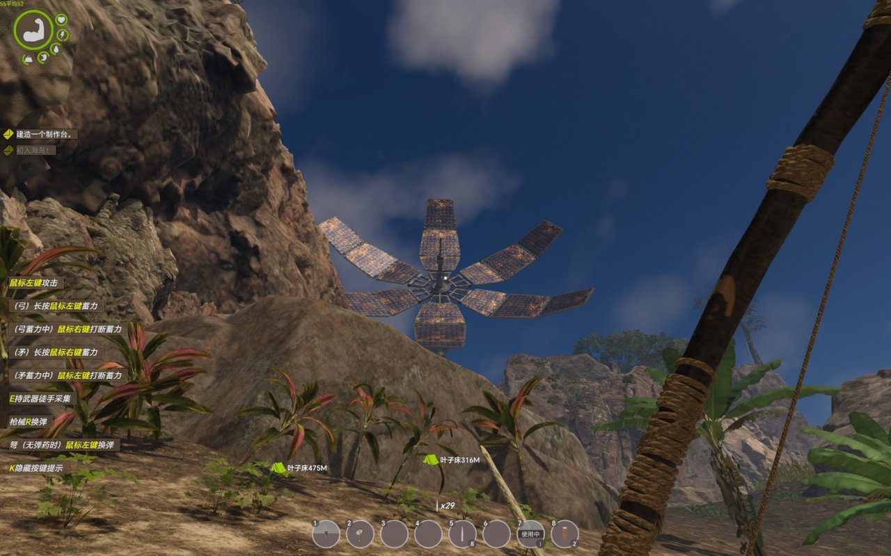 早上醒来以后去收集了一些草和藤条,然后顺带拿了一些树枝准备用火堆烤弯,做了一把简易弓箭还有几根石矛,准备去岛屿深出寻找一些黏土来,毕竟只靠椰子和苔藓补水不是长久之计,寻找水源的同时顺带搞些黏土做几个淡水收集器。