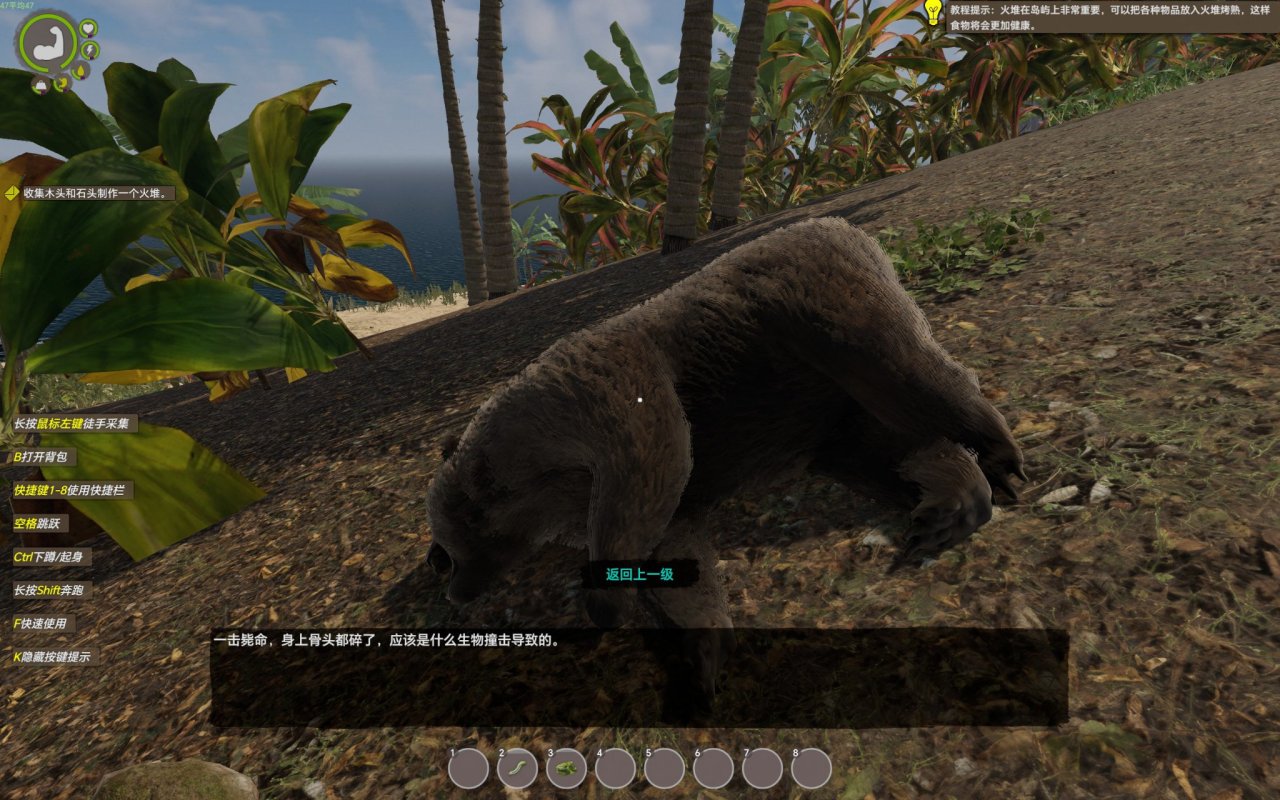 天呐!撞大运了,看到了一只死去不久的熊🐻,上去研究了一下伤口发现骨头都碎了,难道这个岛上还有比熊更大的生物存在?不过想想那只仿佛和神话故事里面克拉肯一样的章鱼🐙瞬间觉得好像也没有什么不可能了,总不能是时代遗落的猛犸象吧。