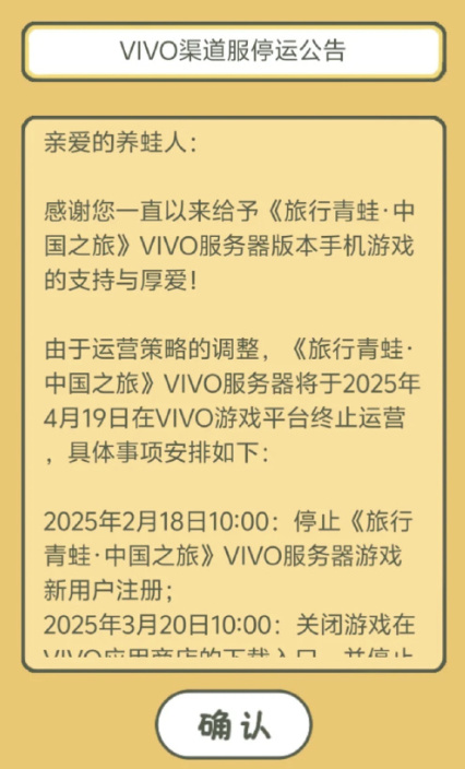 “由於一些不可抗力,我們不得不關閉VIVO渠道的服務。但請大家放心,官服和其他渠道目前仍在正常運營中,大家可以繼續正常體驗遊戲,小青蛙的中國之旅還在繼續。我們也會竭盡全力,讓這段旅程長一點,再長一點……”