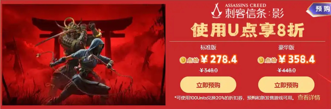 目前《刺客信条:影》已经开启预购活动,官方表示预购情况相当稳健,表现出色!据消息人士透露,《刺客信条:影》与系列中第二畅销作品《刺客信条:奥德赛》在发售前的预购量相当!玩家现在可以在育碧官网使用 100 U 点兑换 20% 的折扣券,标准版到手价 278.4 元,豪华版 358.4 元: