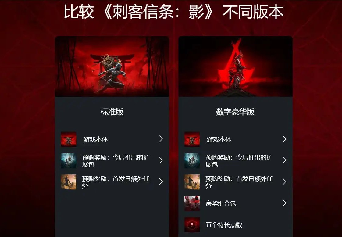 《刺客信条:影》数字豪华版内含基础版游戏,还包括赤龙角色组合包、赤龙藏身处组合包、额外技能点数以及赤龙拍照模式滤镜等,大家可以根据自己的需求选择:
