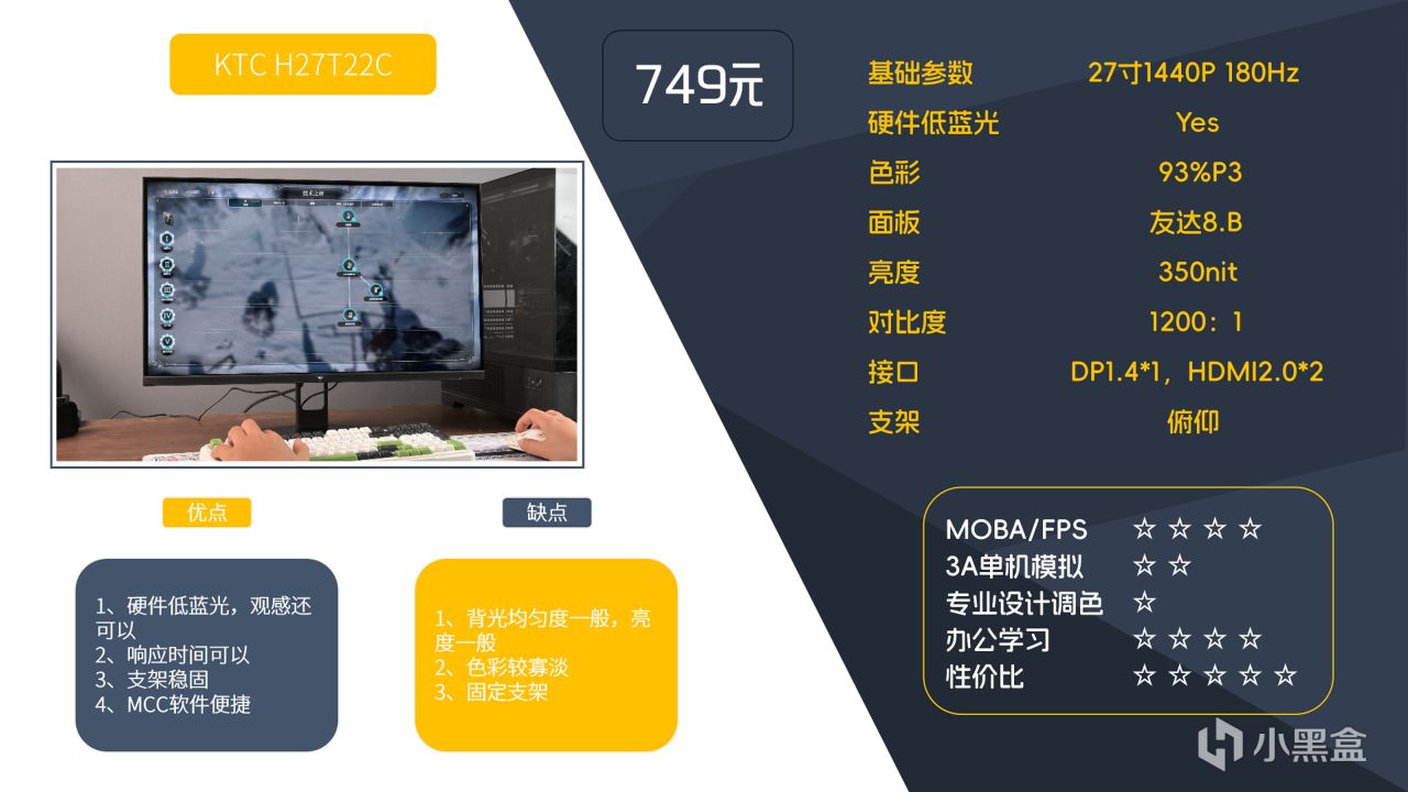 入门2K 180Hz的产品,推荐KTC的H27T22C。首先要知道,700价位的机型不会有特别出色的高参数和高性能。而这台H27T22C在保证了一定的色彩表现,观感不错,OSD功能到位,模具和支架用料不差的情况下,有着出色的硬件低蓝光属性,整体没有大的缺陷。非常值得入门选择。并且这个价位也是入门办公机的领域,但是任何一台办公显示器都达不到H27T22C的色彩,高响应速度以及硬件低蓝光。作为入门产品,强烈游戏兼顾办公的用户选择。