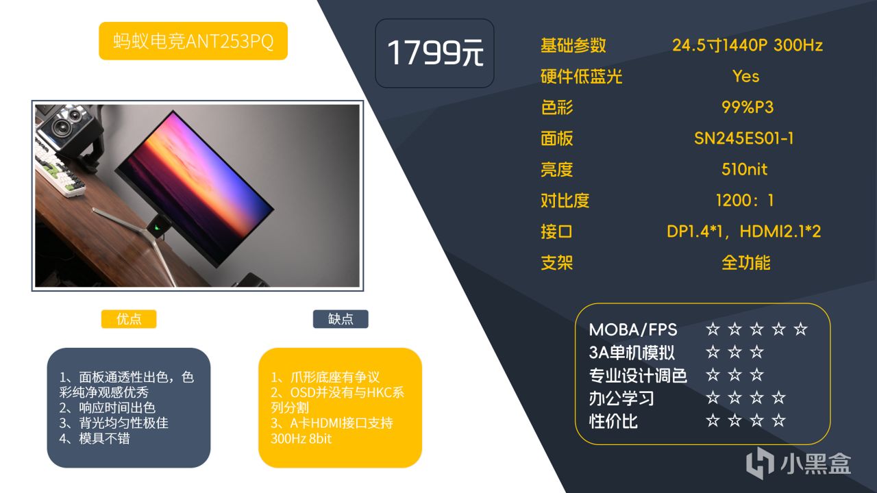 而追求FPS竞技游戏的用户,在今年有福了,高达300Hz刷新率的产品也全面普及开来。目前在售的几款产品中,做的最好的产品,自然是前不久我测试的蚂蚁电竞ANT253PQ。作为惠科定位电竞的高端品牌,他采用的惠科自家面板,拥有非常不错的通透性表现。高达99的P3广色域以及不错的色彩调教,拥有非常不错的画面表现。高达2.9ms的响应时间,结合特调的背光均匀性,显示性能非常出色。这台机器确实可以说一分钱一分货,背光表现力可以说领先竞品至少2档,模具和支架体验也非常不错。当然这台机器也存在争议的地方,爪形底座会劝退一部分用户,OSD实体快捷键的功能有限,OSD功能也不够丰富和自身定位有些不符。