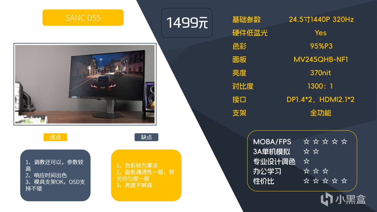 ANT253PQ虽好,但毕竟还是贵了点,SANC D55作为1499元的机器,也是值得选择的。一方面他的价格毕竟便宜了300块,另一方面,这台机器也是比较均衡的一台300Hz的产品了。D55采用的是京东方面板,这块面板有着1300:1的较高对比度,95%的P3色域和不错的色准表现,对付游戏的需求已经足够了。相对于竞品来说,他的背光做的还是不错的。亮度虽然不是那么高,但是对日常游戏使用完全足够了。HDR显示效果也是水准之上,小底座和多功能支架很加分,接口没有阉割,模具摸上去也不掉价。