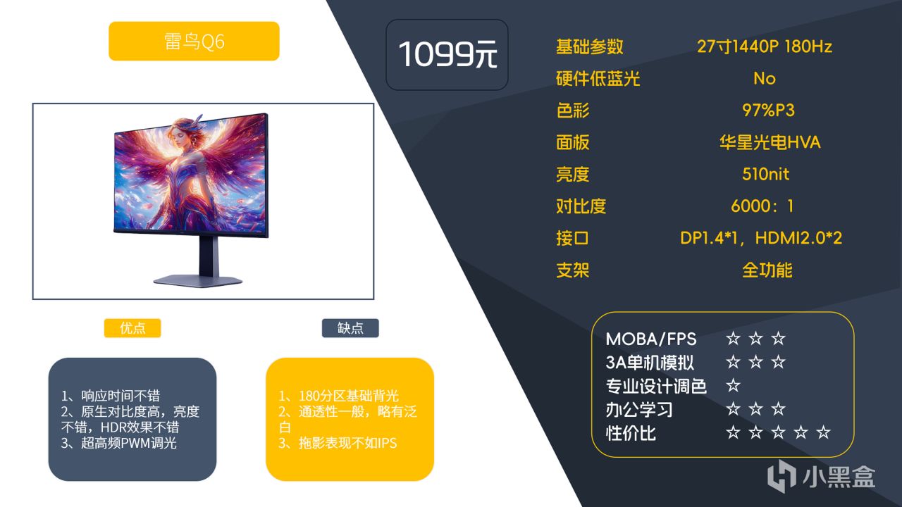 而入门的miniled显示器今年也逐渐发展起来了。KTC那台我还没来得及测试,雷鸟Q6作为千元入门的首选机器,还是毫无问题的。1099元就能买到一款做工和观感都较为优秀的机器,当然是因为他的背光只是最最入门的180分区。但即使如此,它的亮度表现也强过这个价位所有的传统LCD机器.HVA的高原生对比度,结合HDR600的高亮度,使得他的视频和3A游戏的画面表现力,在千元价位无出其右。光晕控制和背光响应时间做的也比较不错,用来作3A游戏和视频需求是非常不错的选择。当然了,这款产品的拖影相交于IPS显示器还是不足的,不建议FPS竞技用户选择。