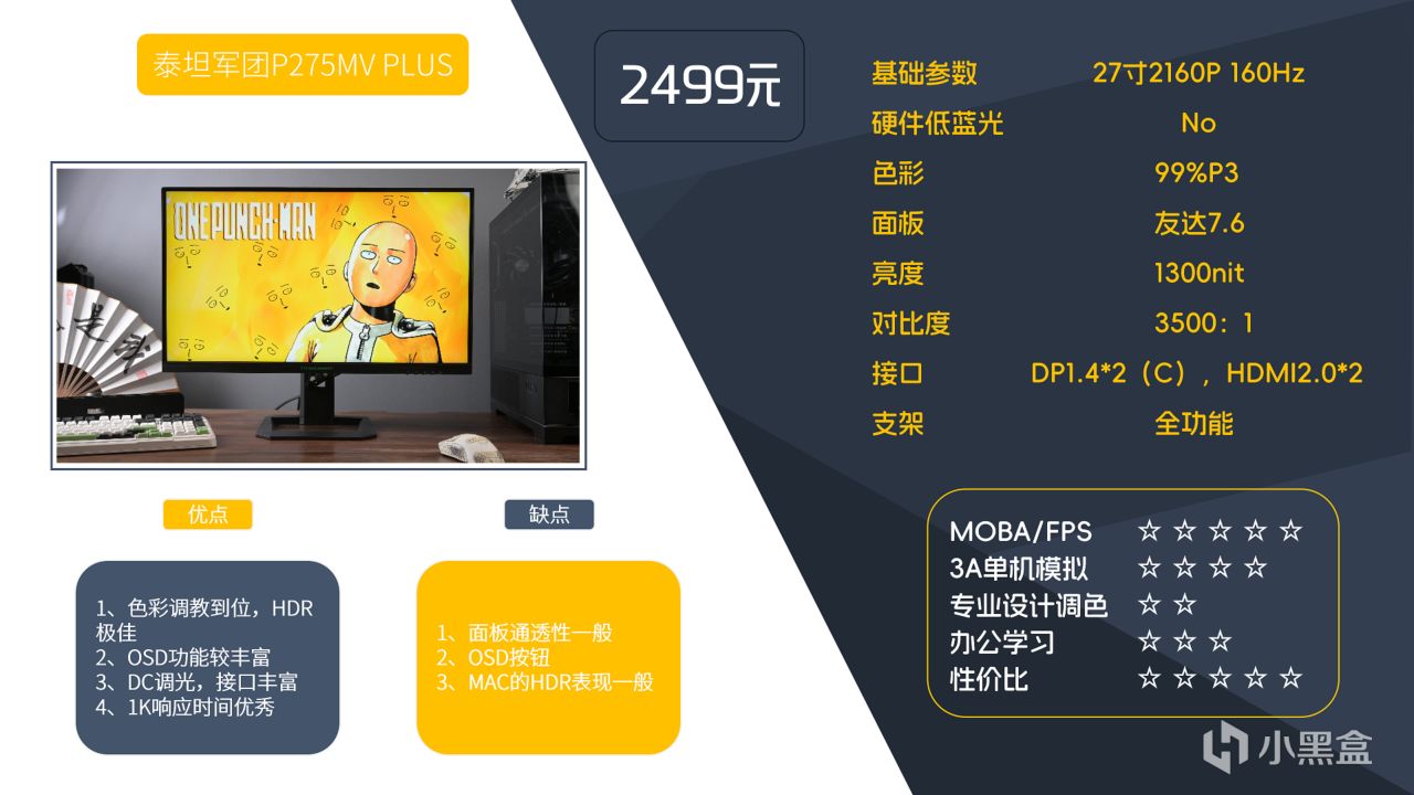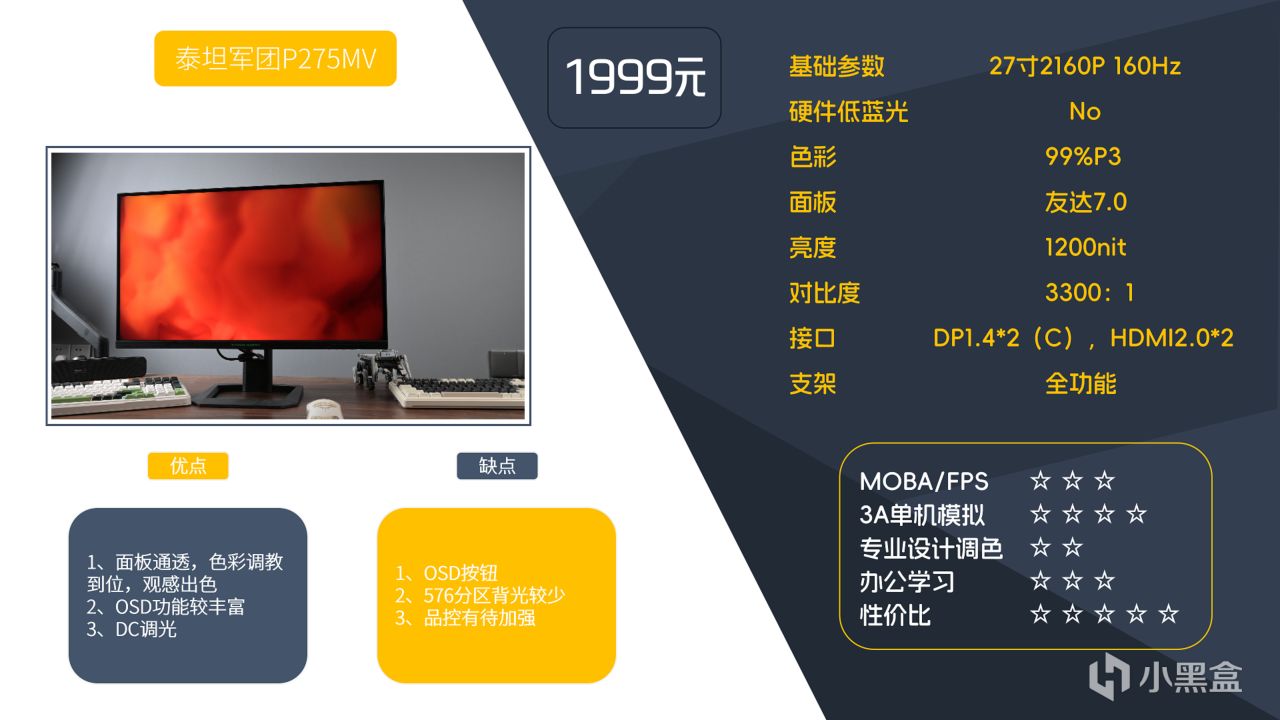 而随着泰坦军团P2710V的降价,这台机器的性价比真的无出其右了。1299的价格,相对比竞品,在保证了色彩和观感到位的同时,P2710V有着出色的硬件低蓝光,多功能支架。并且在色彩调教上,泰坦军团是相对优秀的,整体机器的把控是很好的,完全可以看作是一台4K入门高刷水桶机了。即使不打游戏,他较为优秀的面板观感和硬件低蓝光护眼,用它来兼职办公都是很好的选择。缺点仍然是泰坦军团的模具不支持OSD摇杆。