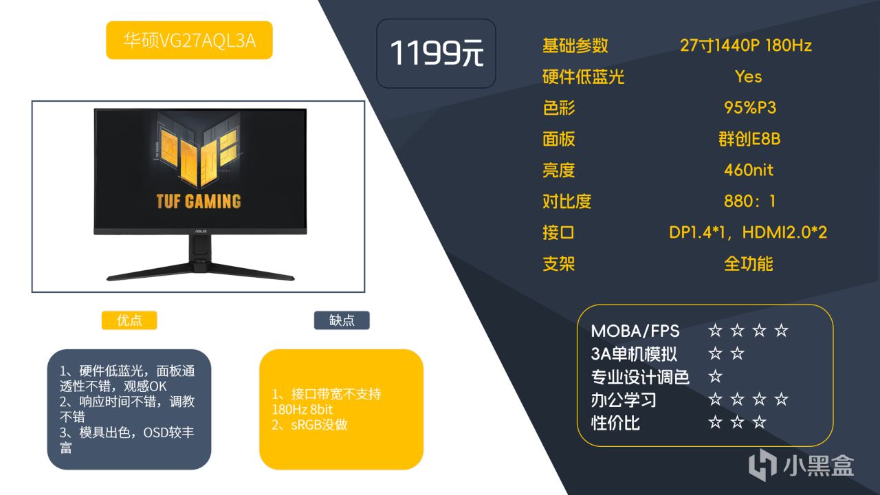 如果你考虑大牌,这台华硕VG27AQL3A就很适合,现在这台机器的价格也降到了1199元,华硕的模具、做工和OSD都绝对是这个价位首屈一指的,在性能上色彩调教出色,亮度优秀,响应速度不错,群创的面板通透性很棒,仅对比度是劣势。不过这台机器最大的遗憾,还是DP1.2接口,只能开启2K 180Hz 8bit,而且他还没有做sRGB模式,所以这台机器综合来看,是非常适合竞技游戏使用的,对于视频和3A用户来说,考虑华硕其他型号吧。