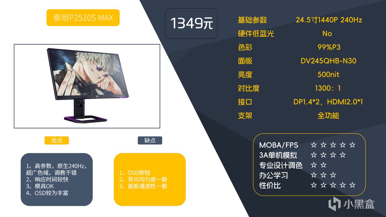 这块面板比较好的机器,我个人认为是泰坦军团做的P2510S MAX,这台机器脱胎于此前的P25M2S,也是泰坦接受到网友们对于小底座的需求,他的色彩应该是竞品中第一的存在。采用QD量子点+特调的高亮度背光,让他的色彩达到99%的P3色域覆盖以及HDR500的最佳画面表现。这台机器具备了全功能支架,在操控和稳定表现上显然更好。并且OSD功能更丰富。