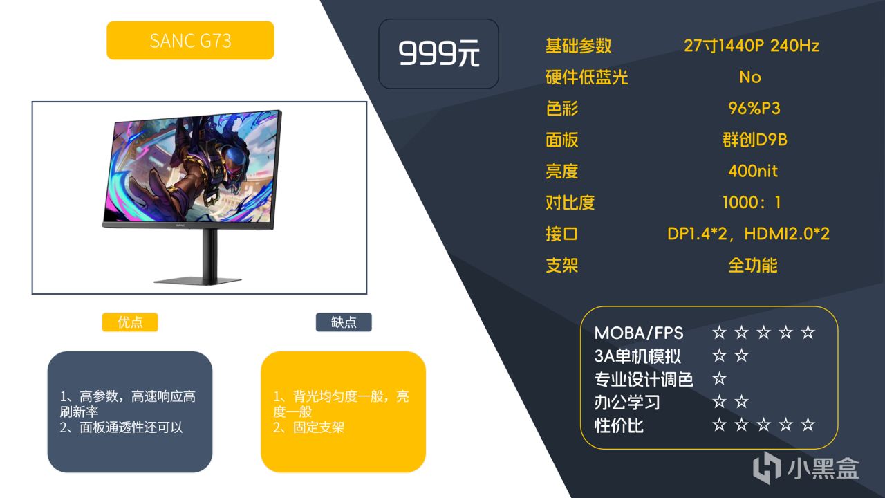 那么到240Hz的产品,性价比神机就是SANC的G73了,很难想象27寸2K 240Hz的显示器被sanc砍到了999,如此低的价格还没有减配。这台机器采用群创D9B面板,其通透性比京东方的NF1更好。G73采用升降旋转支架,350nit亮度,OSD摇杆,色域缩限,较为完善的OSD功能,色彩和响应速度的调教都在水准之上,整体模具完全不掉价,非常适合预算不多又追求大屏竞技游戏体验的同学选择。当然了,给到这么低的价格,他的背光调教还是比较一般的,亮度均匀性的表现还是抽奖