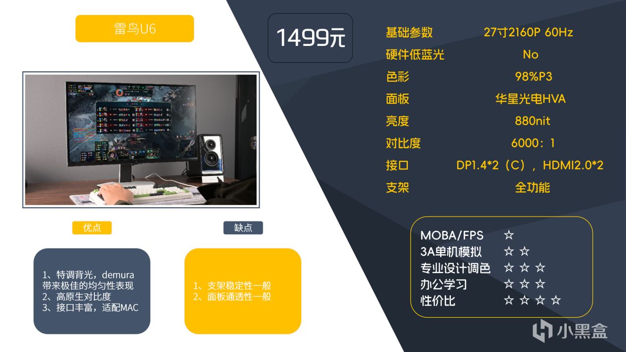 接着还是插播一台雷鸟全新的机器,雷鸟U6。这台机器和Q6一样,采用了入门级别的180分区背光,结合HVA面板,他在亮度和对比度的表现,是天然比传统侧入背光的机器强很多的。虽然他仅是4K分辨率60Hz的慢速VA机器,画面拖影的控制相对比众多快速液晶面板,可以说非常垃圾。但是对付普通的游戏需求和办公是毫无问题的。那推荐这台机器的关键是什么呢?目前市面上的入门4K显示器,这是一台做到极致背光均匀性的机器,或者可以说,没有任何一台2K以内的机器在这方面比他更好了。再加上不错的色彩调教,这台机器我认为就非常适合,预算不多的专业设计以及调色的需求。要和目前的游戏面板比较,他并不适合打游戏。