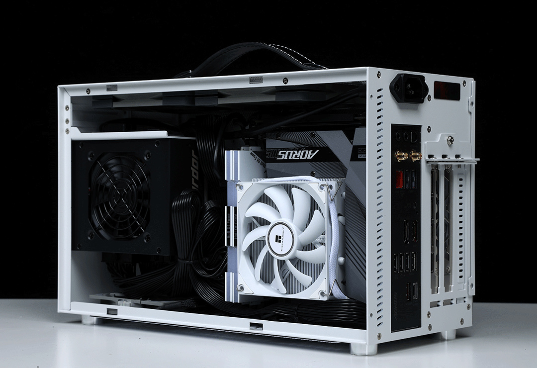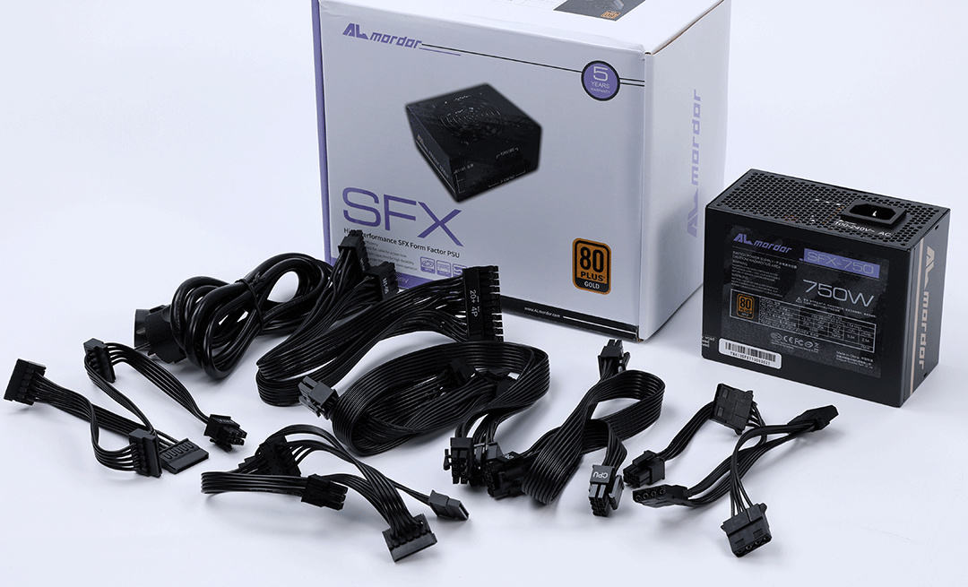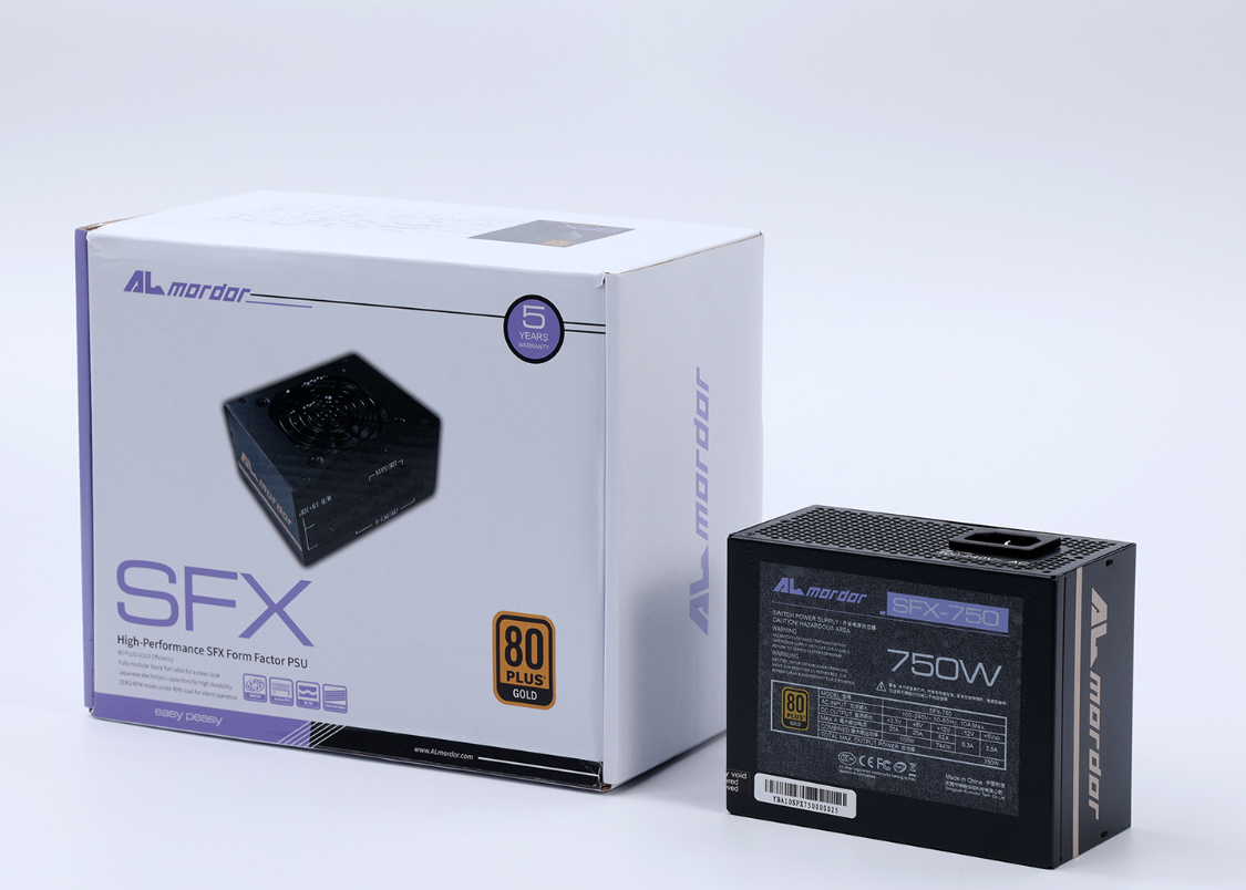 裝好散熱後,準備安裝電源。今天裝機使用的是神鵰十三道(Almordor) SFX 750W金牌全模組電源,SFX規格,三圍125*100*63.5mm,適配絕大多數小型機箱中,全模組再加上柔軟的扁線設計也降低了裝機時的理線難度;