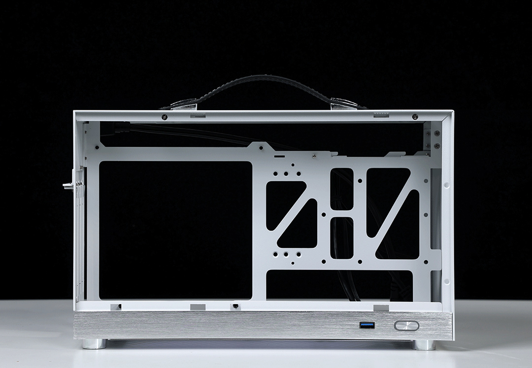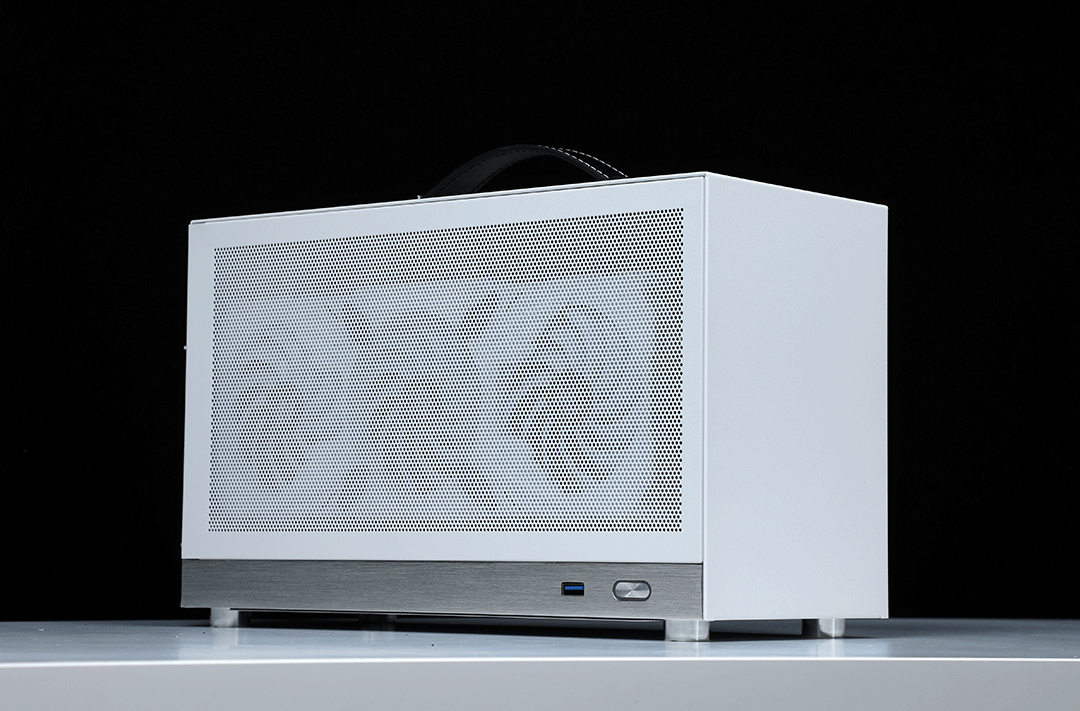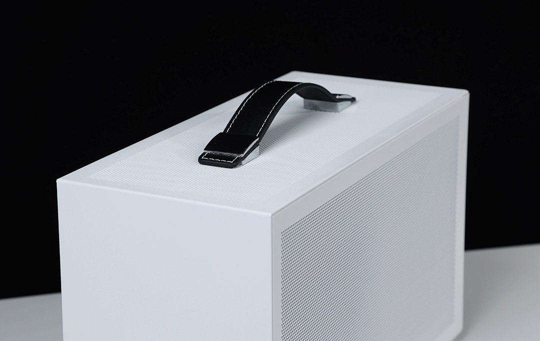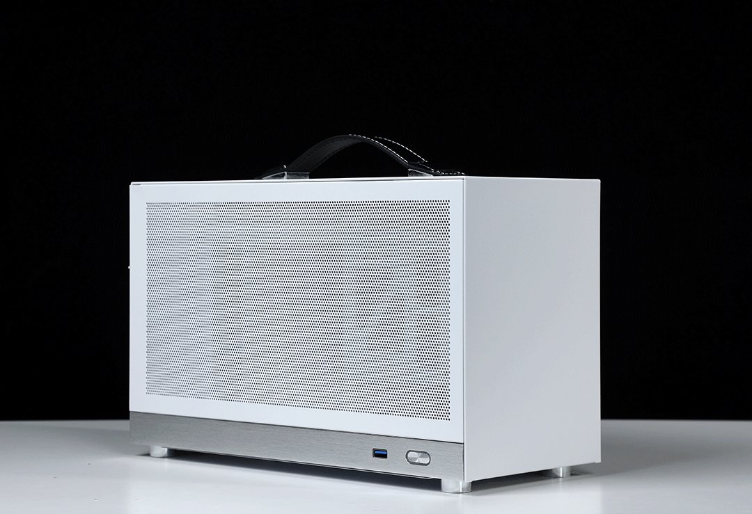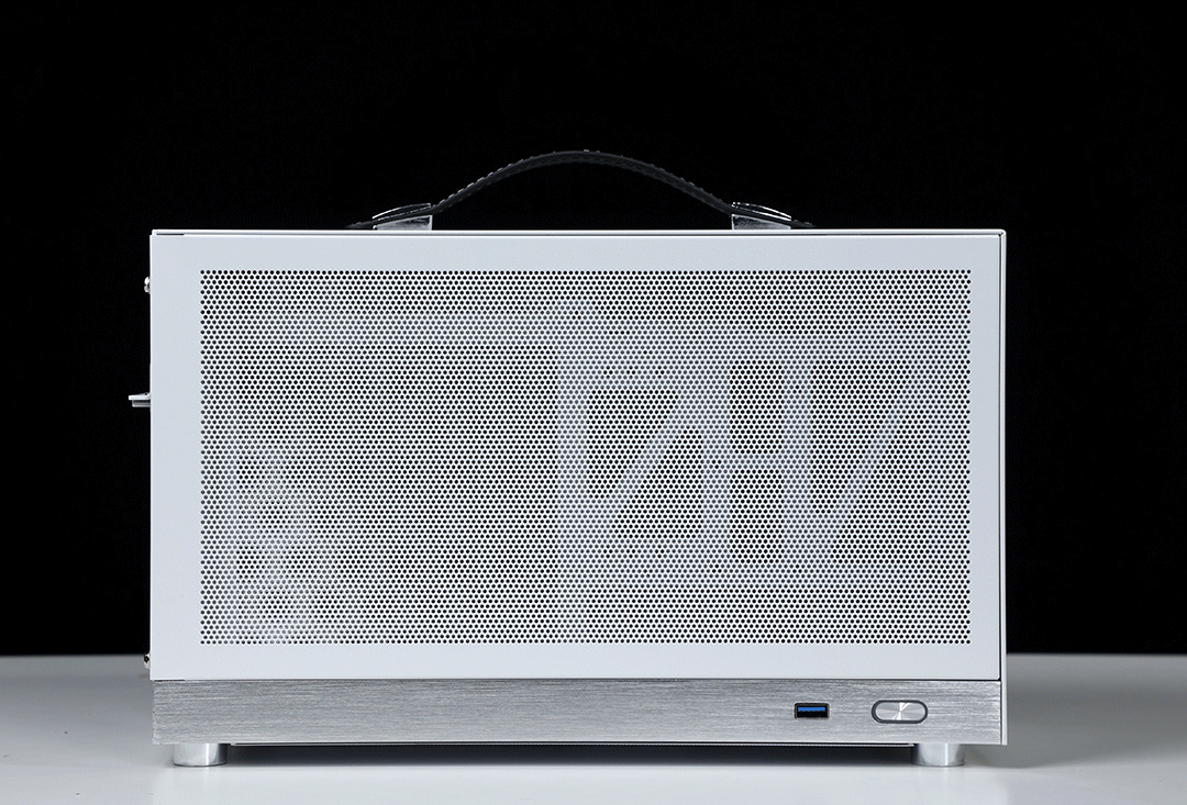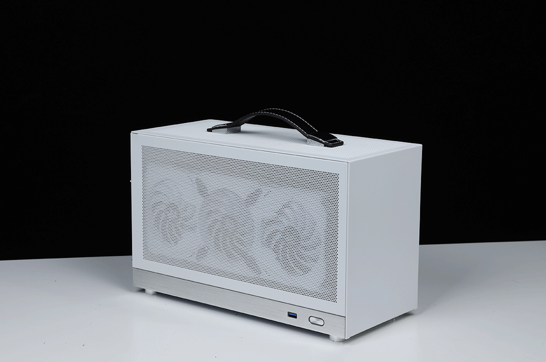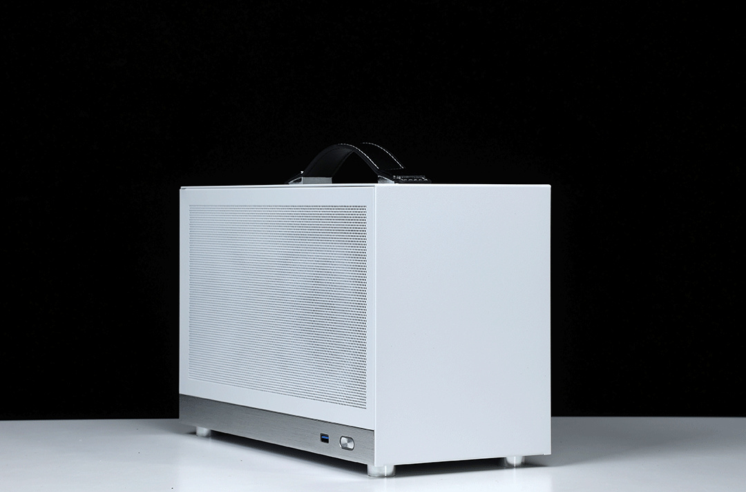 機箱整體採用SPCC高強度鋼材質作爲框架主體,用料紮實結構穩定,側板底部則爲銀白色的鋁合金裝飾條(有金屬拉絲工藝處理),機箱頂部配備了一根高強度皮質提手,在提手內部固定鋼條的加持下,整個提手最大承重重量可達20KG;