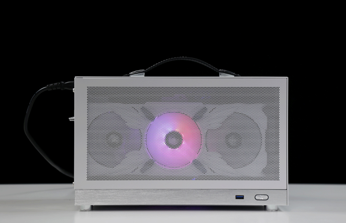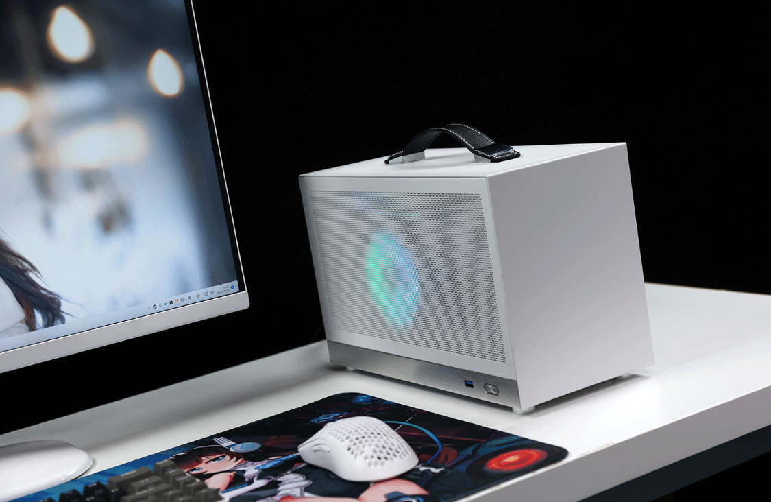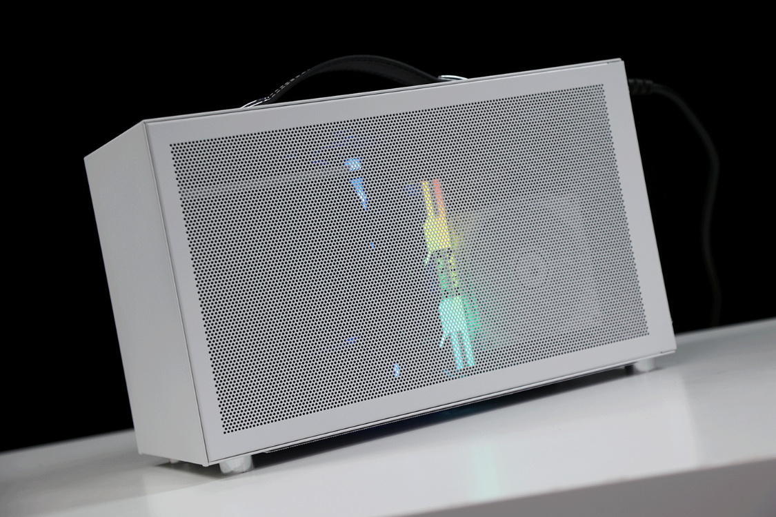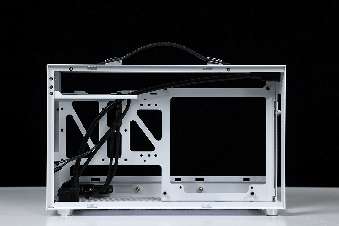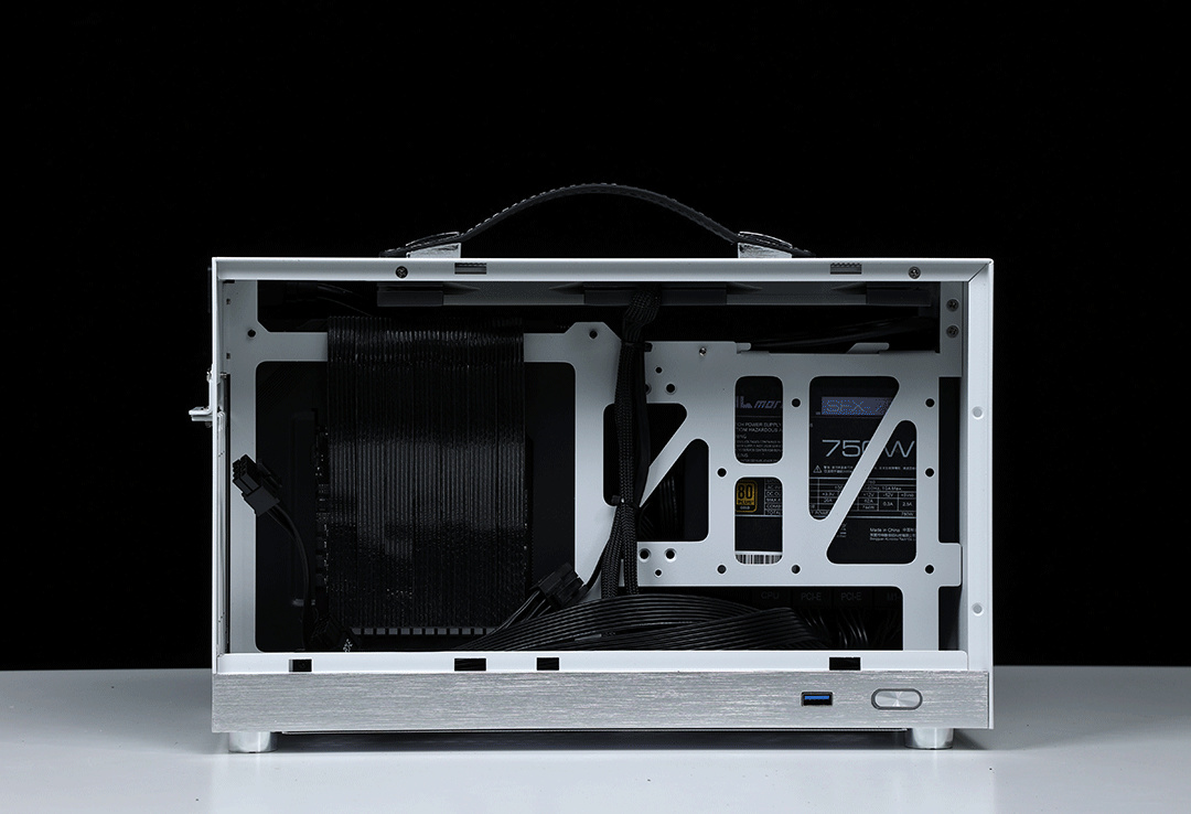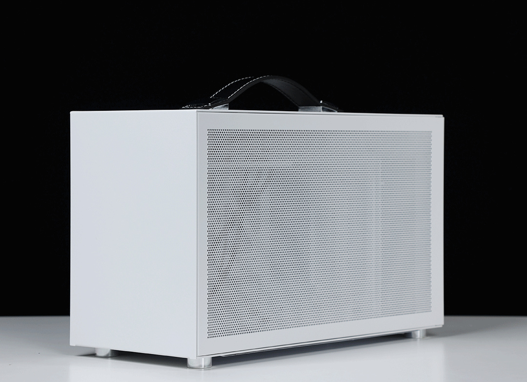 機箱整體採用SPCC高強度鋼材質作爲框架主體,用料紮實結構穩定,側板底部則爲銀白色的鋁合金裝飾條(有金屬拉絲工藝處理),機箱頂部配備了一根高強度皮質提手,在提手內部固定鋼條的加持下,整個提手最大承重重量可達20KG;