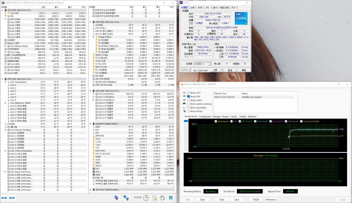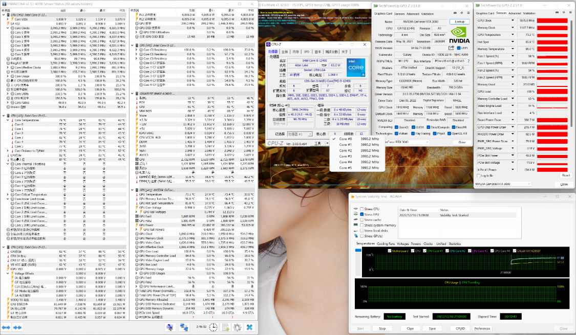 雙烤10Min,顯卡功耗爲370W左右,顯卡溫度爲73°左右,CPU封裝溫度爲82°,CPU功耗爲80W左右。整體散熱表現,依然相當優秀。