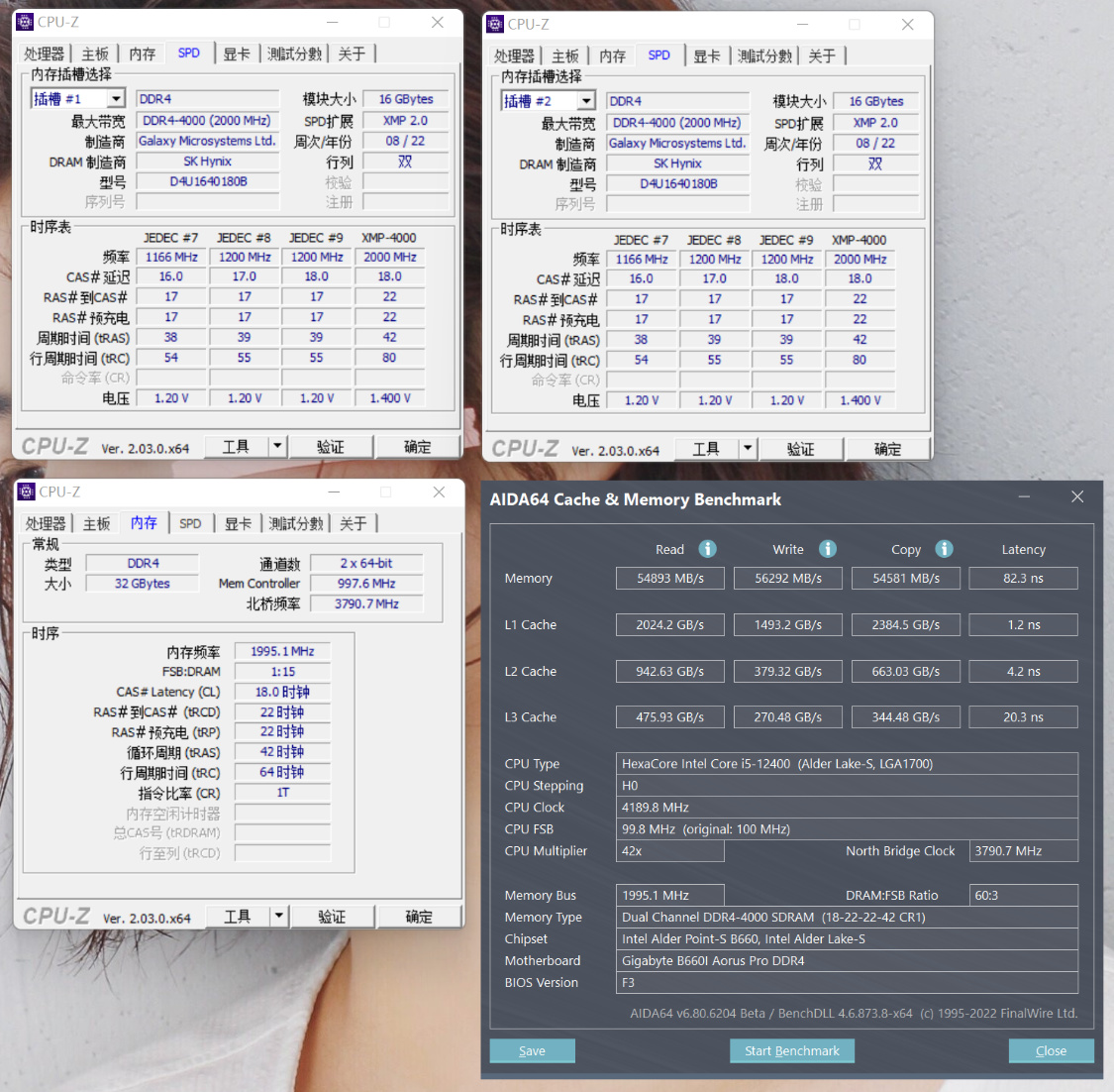 內存讀寫測試,XMP開啓,內存讀取速度爲54893 MB/s,寫入速度爲56292 MB/s,複製速度54581 MB/s,延時爲82.3 ns;
