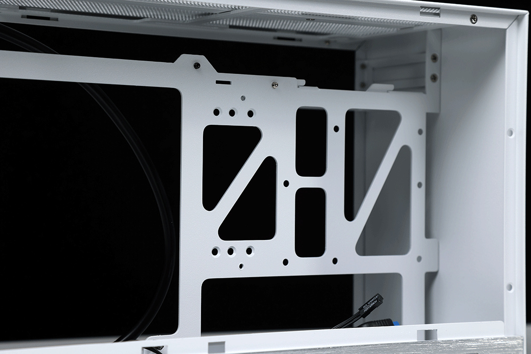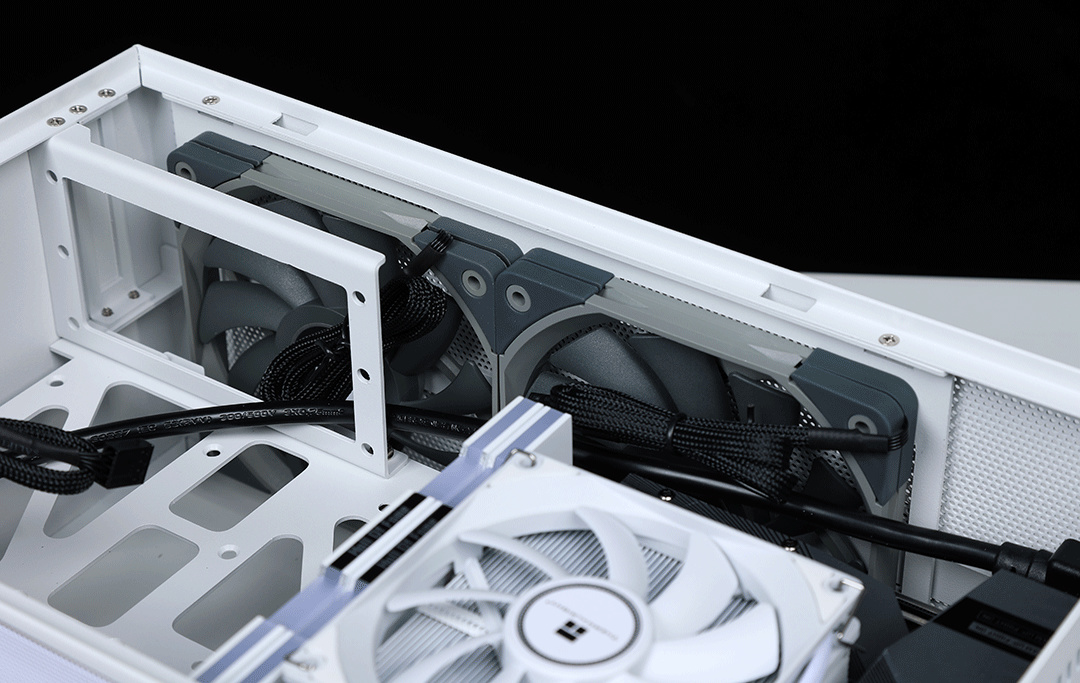 散熱方面,機箱支持安裝風冷限高65mm,同時支持選購水冷支架,在電源倉背部安裝一個120水冷(顯卡限長降至200mm)。機箱頂部提供了兩個12cm薄扇位,可以安裝兩把厚度在15mm以下的12cm風扇,機箱的電源倉底部也預留了一個可以安裝厚度在15mm以下的9cm風扇位;