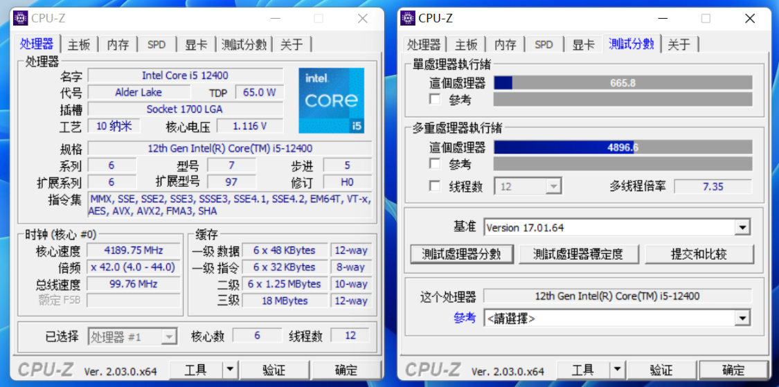CPU-Z基準測試,單核得分665.8分,多核得分4896.6分;