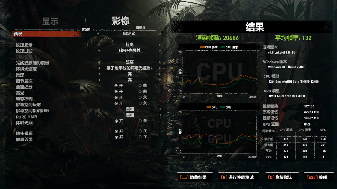《古墓麗影·暗影》基準測試,畫質最高,光追超高,DLSS超強性能,4K分辨率下,遊戲平均幀率爲133FPS;