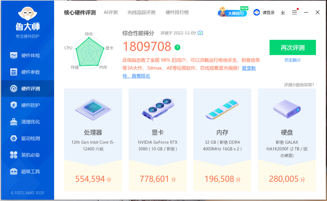 魯大師整機測試得分180W分;