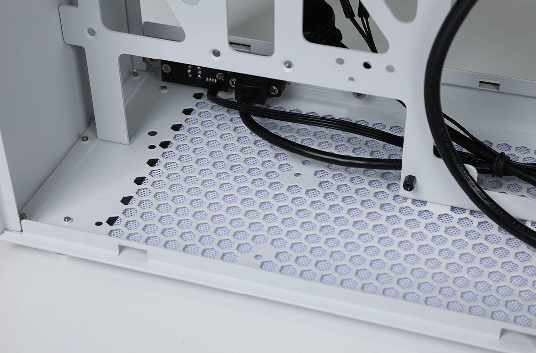 爲了強化散熱效果,機箱採用了箱體以MESH面板爲主,除機箱正臉外,其他各面均有大面積開孔設計,可以有效提升整個機箱的熱交換性能,增強機箱的散熱能力。另外,在機箱底部還配置一張磁吸式防塵網;