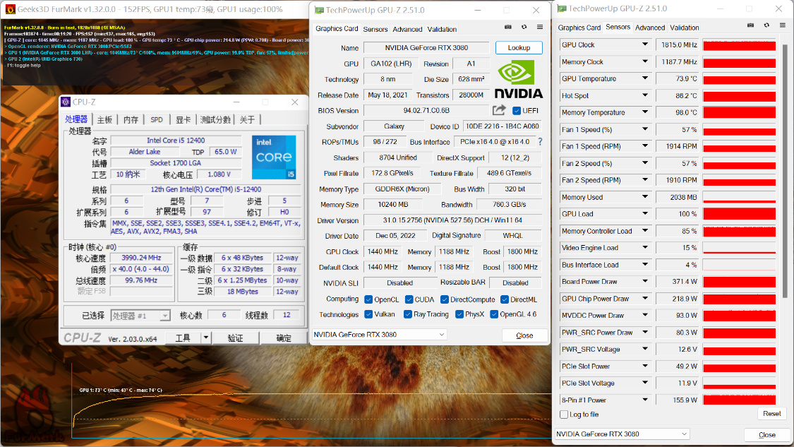 FurMark顯卡烤機測試,烤機10Min,顯卡溫度爲74°左右,顯卡功耗爲370W左右。就這溫度你還覺得小機箱真的散熱不好?