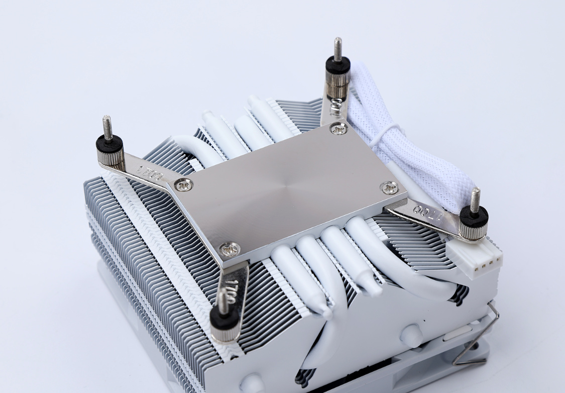 54片散熱鰭片表面均有白色的納米級噴漆鍍膜塗層設計,既能提升散熱能力,還能拔高整體顏值。鰭片之間通過扣Fin的方式相連,再採用二次焊接的技術,將散熱器熱管與底座緊密相連,極大的提升了散熱器主體的結構穩定性;大面積精雕銅底,搭配鍍鎳工藝處理,可以更好地貼合12/13代酷睿處理器頂蓋;